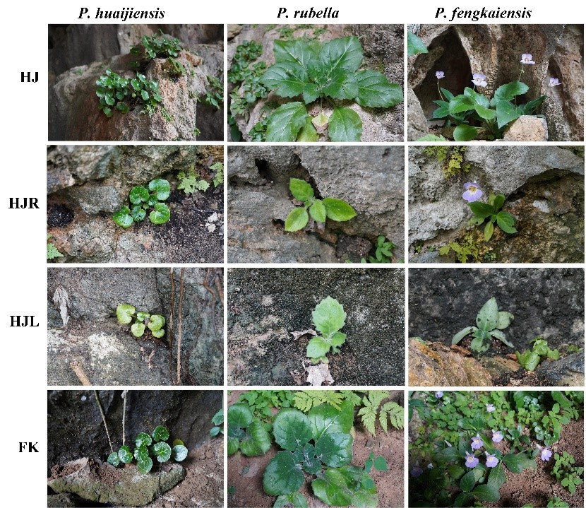 Fig.1. Growth status of the three Primulina species at the four sites.(Imaged by LI et al)