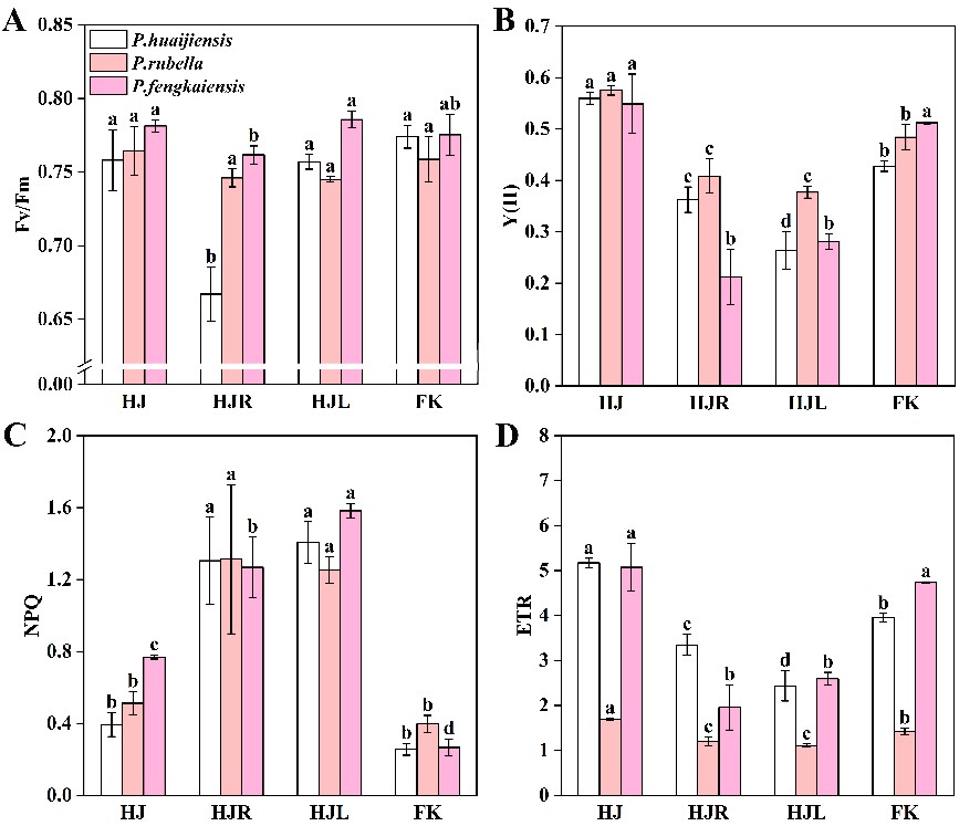 Fig. 2. Fv/Fm values (A), Y(II) values (B), NPQ values (C) and ETR values (D) of the three Primulina species at the four sites.(Imaged by LI et al)