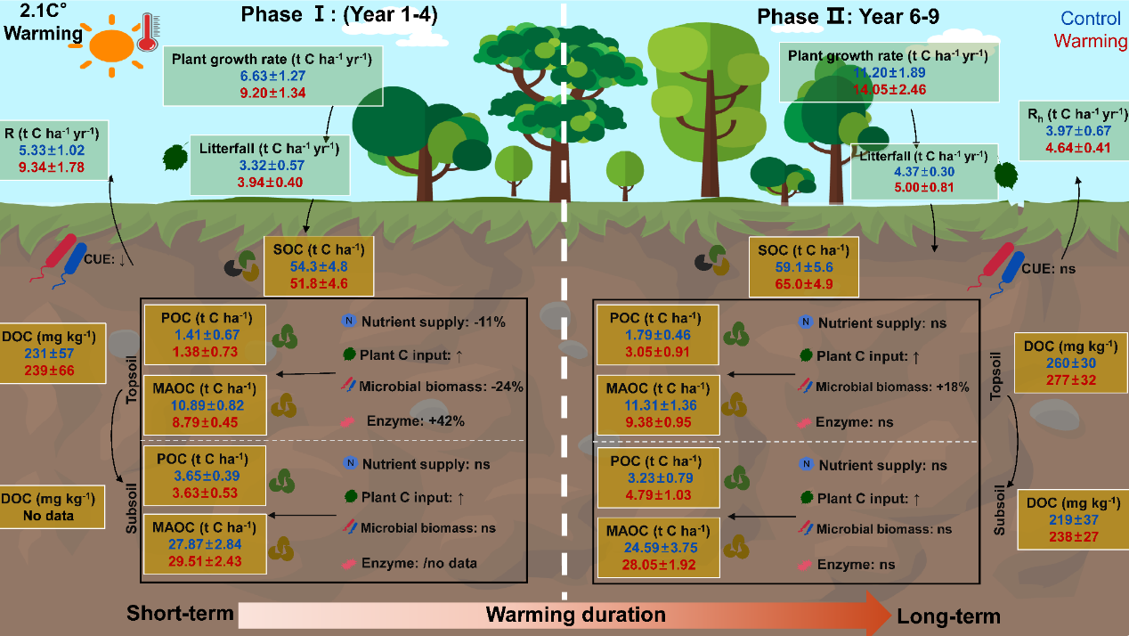 “Our results show that moderate warming does not necessarily lead to soil carbon loss. Sustained plant carbon inputs and microbial thermal adjustments can help maintain—or even enhance—soil carbon storage in some humid subtropical forests,” said Dr. LIU Xujun, first author of the study.
