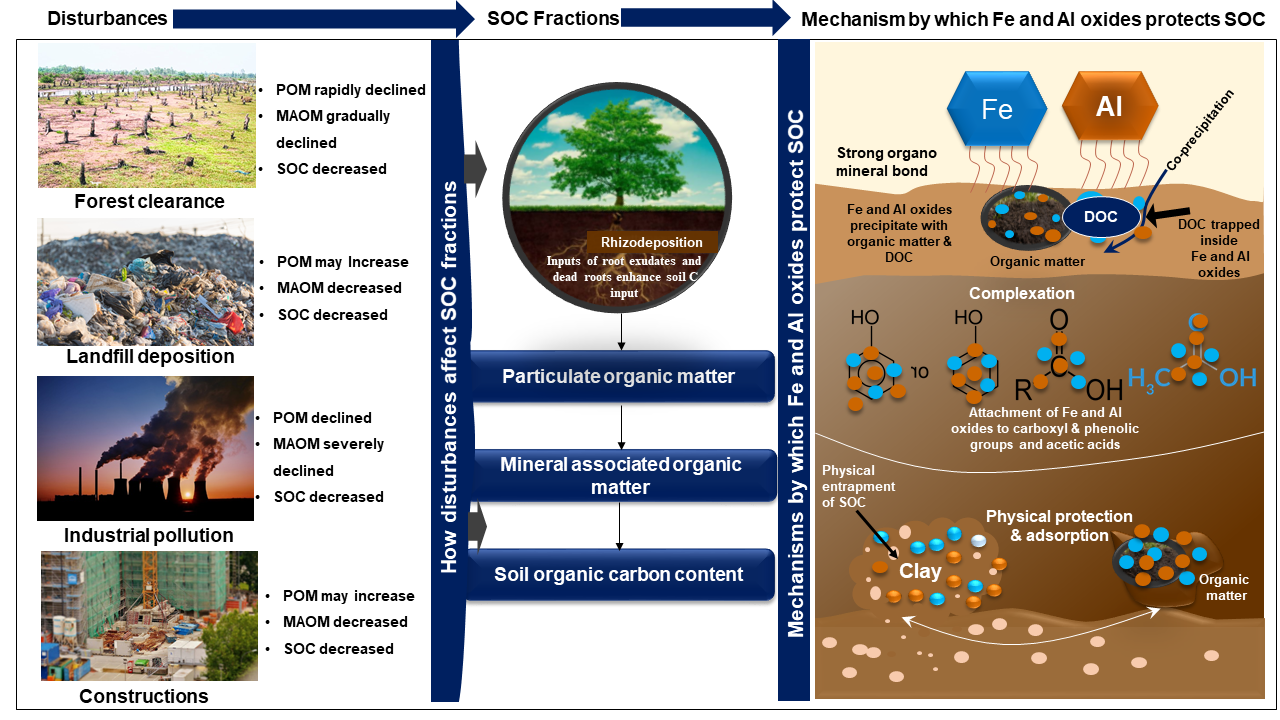 Fig. 2. Impacts of anthropogenic disturbances on soil organic carbon (SOC) fractions and the mechanisms by which iron (Fe) and aluminum (Al) oxides stabilize SOC.(Image by LU et al.)