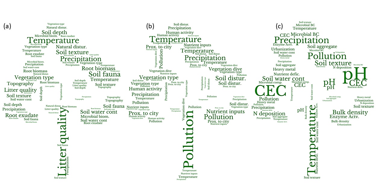Fig. 3. Influencing factors of SOC stability in rural forest (a), sub-urban forest (b) and urban forest (c).(Image by LU et al.)