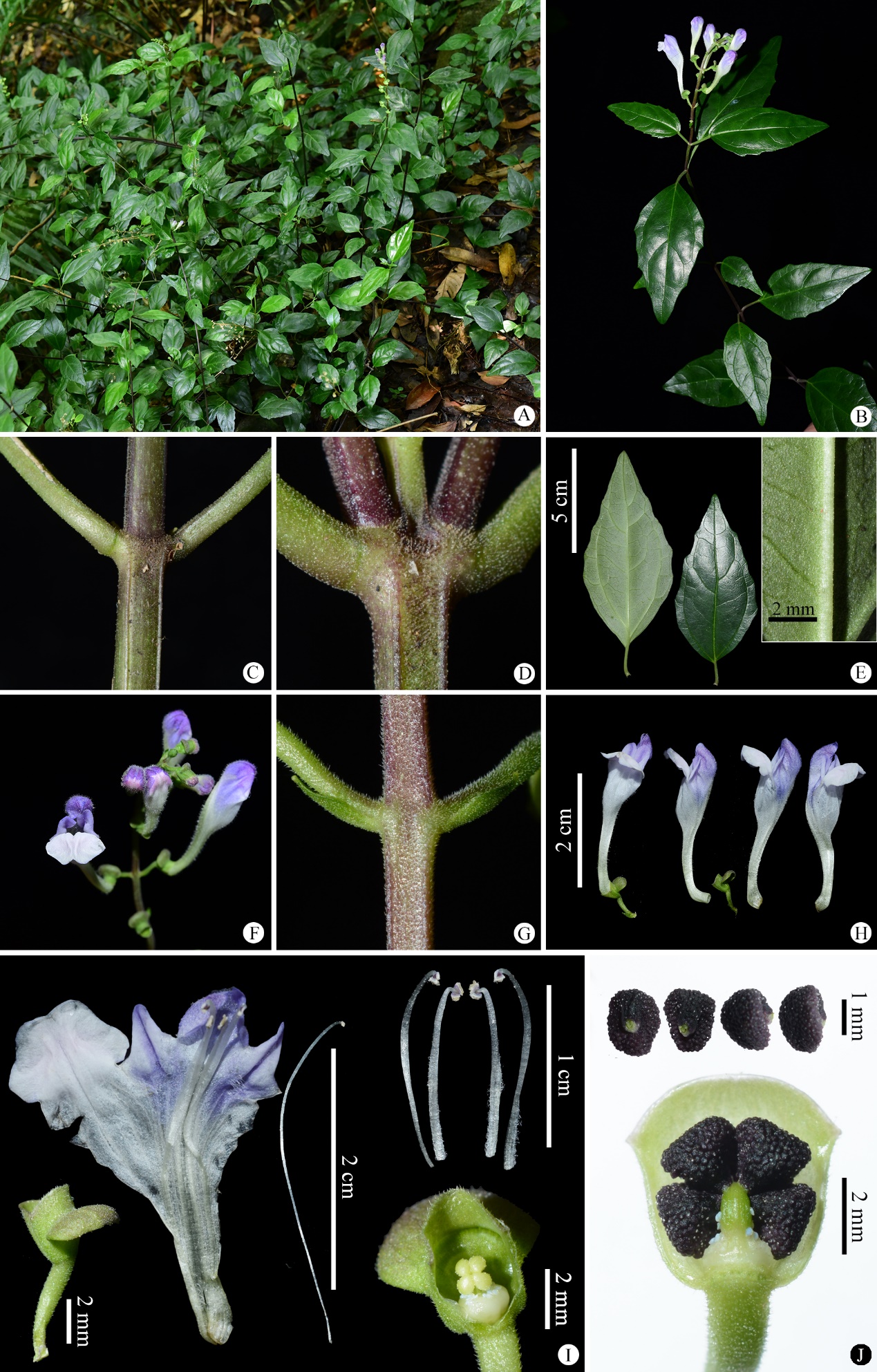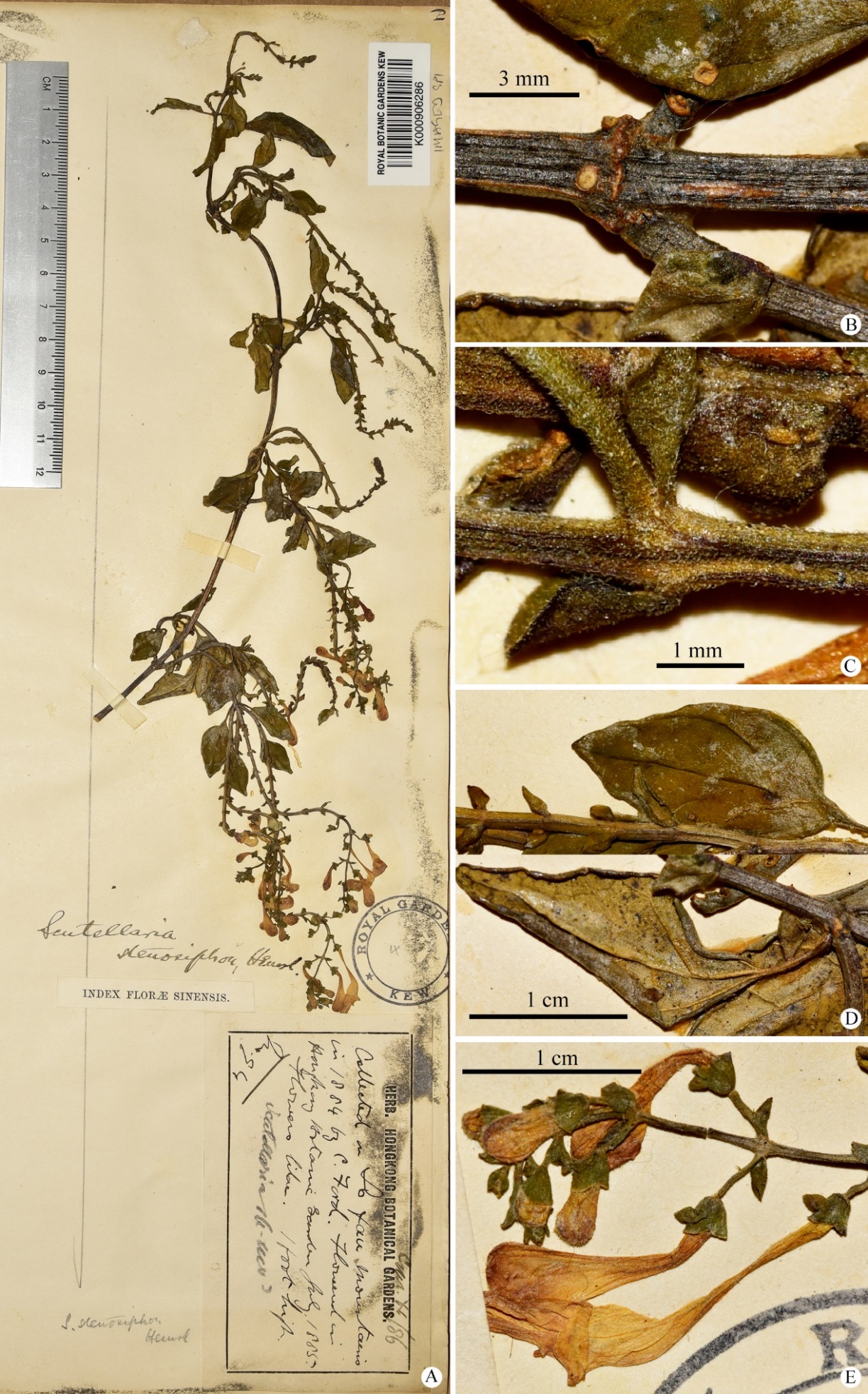 Fig. 4. Type specimen of Scutellaria stenosiphon, showing close-ups of the stems, leaves and flowers.(Image by ZENG et al.)