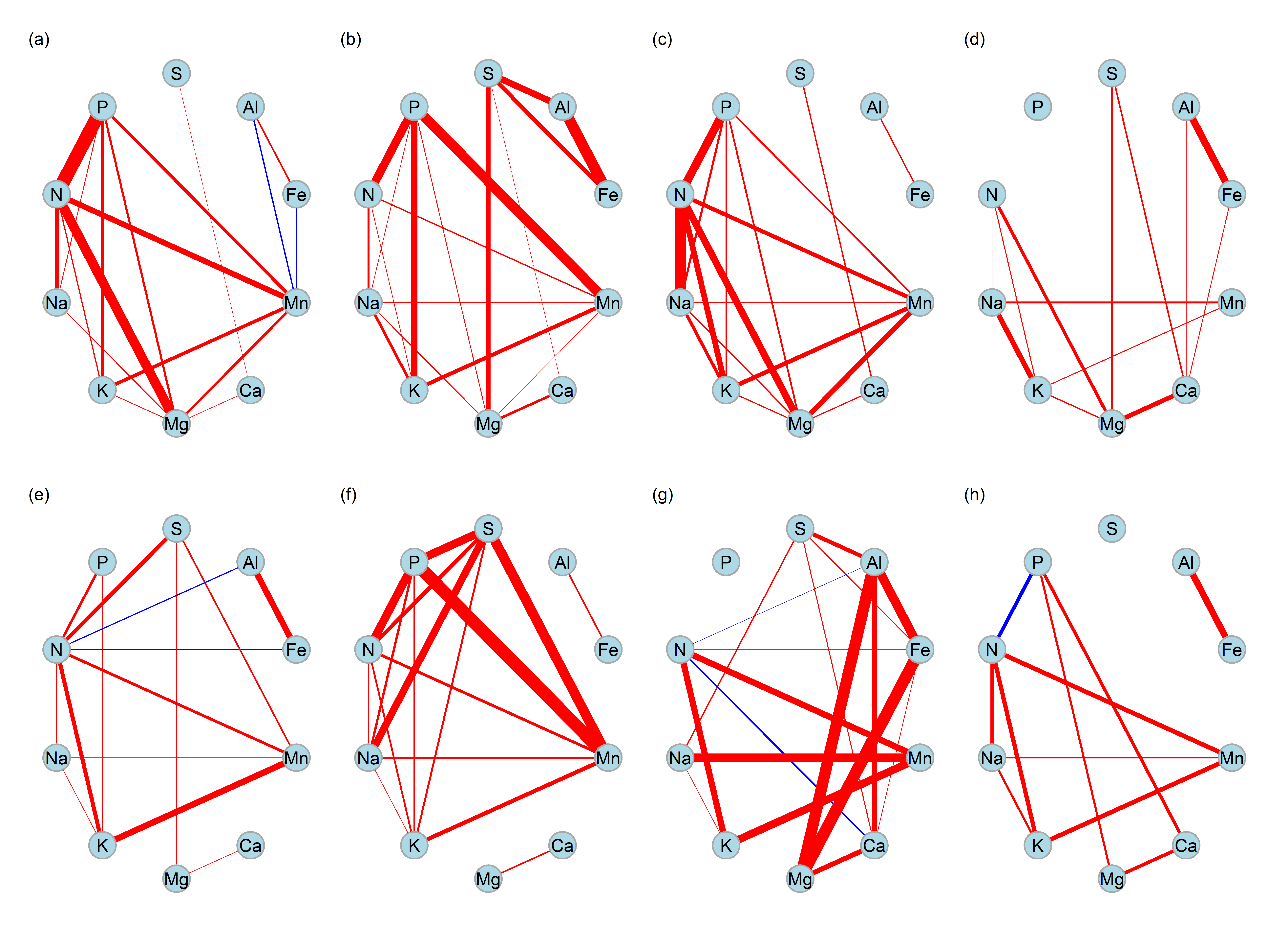 The results showed that both EU and AA maintained stable macro-element (N, P, S, K, Na, Ca, and Mg) levels under long-term N addition, yet experienced significant changes in their micro-elements (Al, Fe, and Mn), particularly for root Al and Fe in EU and leaf Fe in AA. Long-term P and N + P addition significantly enhanced tissue P and Na but decreasedtissue K, especially in leaves. Crucially, long-term N or/and P addition altered elemental correlation patterns. Specifically, long-term N addition strengthened S interaction with other elements in both species, whereas long-term P disengaged P from other elements in AA, and long-term N+P addition disrupted P interconnectedness in EU. Moreover, long-term N+P addition simplified mineral element network interactions in both species (Figure 1). These shifts in elemental correlations highlight potential cascading effects on ecosystem structure and function.